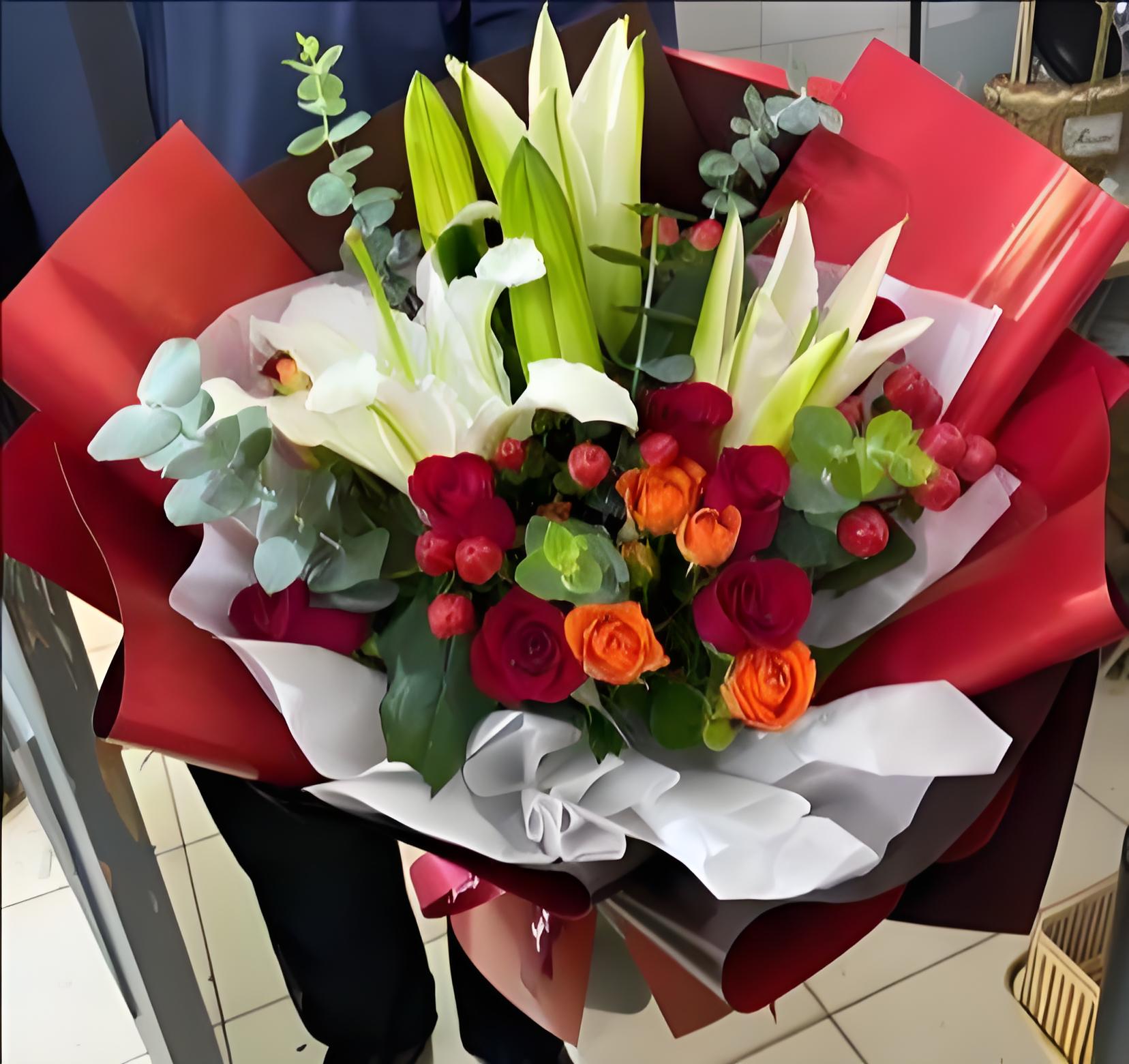 丽江永胜县花店包11枝红玫瑰、2枝多头白百合、6枝橙色多头玫瑰、红豆、尤加利叶